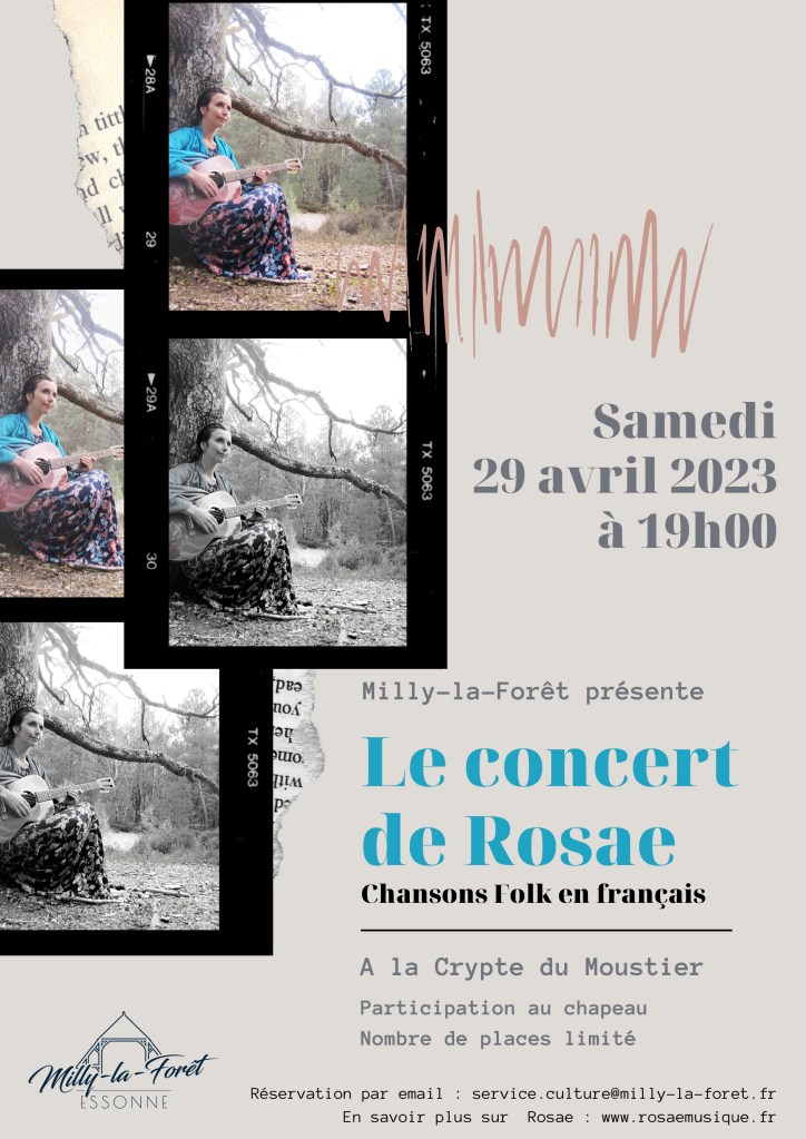 C’est samedi prochain à 19h à Milly-la-Forêt ! A la Crypte du Moustier 47, rue Langlois. Heureuse de vous présenter mes chansons en live. A bientôt ! Rosae